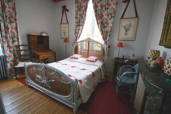 double-rideaux et les carreaux rouge et blanc des petits coussins posés à la tête du lit, s’harmonisent avec le boutis et les draps anciens en fil blanc, également chinés. Le parquet XIXème en chêne, a été décapé et ciré. Lire la suite