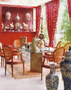 Philippe et sa femme Michèle sont tous deux passionnés pour les arts. Ainsi, la décoration du château vit et bouge au fil des rencontres : avec un objet, un guéridon, une applique, une toile, une aquarelle, une sculpture, une étoffe, un tapis. Chaque pièce à sa propre identité. Dans le petit salon réchauffé par une cheminée, les boiseries habillent les murs et l’œil est attiré par une collection de porcelaines de l’époque Ming ou une vitrine protégeant des sculptures chinoises anciennes tirées de racines de buis. Les chambres sont aussi toutes décorées dans un esprit différent : faste d’un lit à baldaquin, style néo-victorien… avec un mobilier original, des objets uniques et chinés au fil des années.
