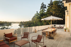 Au rez-de-chaussée, la grande pièce de vie réunit cuisine et salle à manger. Autour d’une table en bois chinée, douze convives prennent place sur des chaises bleu ciel HAY, tandis que la cuisine habillée de faïences Normandy Ceramics ouvre la promesse de moments généreux. Le salon, organisé autour d’une vaste banquette dessinée par l’agence, respire la convivialité et s’ouvre sur une large terrasse tournée vers l’Aven. Mobilier Palissade de Ronan et Erwan Bouroullec, assises Vincent Sheppard : tout invite à profiter du souffle de la rivière. Plus bas, une seconde terrasse attenante à la piscine intérieure prolonge l’expérience dans un cadre intime et apaisé.