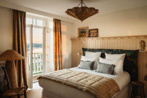 Chacune des quatre chambres doubles de la maison principale possède son caractère propre tout en s’inscrivant dans une harmonie subtile. Les bleus rappellent le miroitement de l’eau, les verts traduisent la fraîcheur des bois, tandis que les jaunes diffusent la chaleur d’un rayon de soleil traversant les rideaux. Les têtes de lit, habillées de tissus Dedar ou sculptées dans le bois selon la tradition bretonne, invitent à un voyage au cœur des songes.