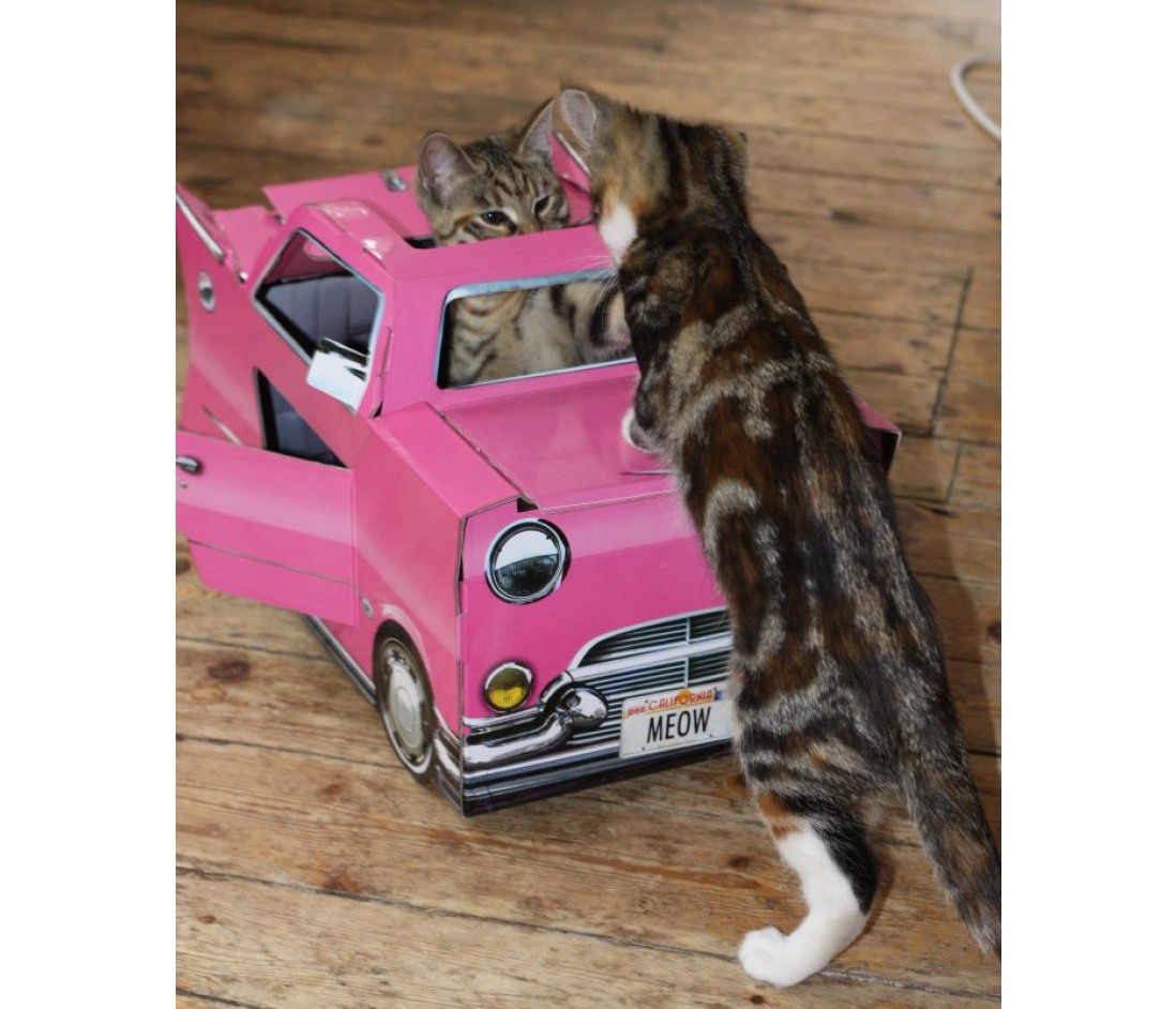 Adieu les cartons tristounets pour jouer et se cacher… Les minous d’aujourd’hui s’amusent dans un avion ou même encore mieux dans une Cadillac rose !