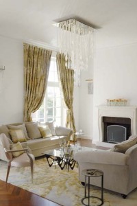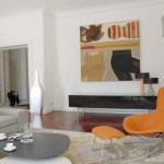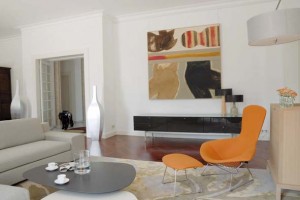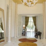 Pour ce projet, l’équipe souhaitait créer une ambiance à la fois décontractée et raffinée. Elle a opté pour la création de meubles dessinés par ses soins qui se mêlent au mobilier signé par de grands designers. Un travail important a également été réalisé sur le choix des luminaires et des couleurs pour donner le maximum de chaleur au lieu. Dès la porte franchie, on découvre un magnifique et imposant lustre créé sur mesure par Art & Floritude. Composé de pastilles de couleurs or, blanc et argent, il « flotte » au plafond comme un nuage auquel « répond » un tapis « Pastille » aux couleurs naturelles. Le salon a été imaginé à la fois comme un espace familial et un lieu de réception. Son beau volume a donc été divisé pour créer deux univers. Le salon lounge mélange des styles classiques et contemporains aux couleurs douces relevées par l’orange des fauteuils Bertoia, tandis que le salon cheminée, se veut plus élégant, les luminaires en pyramides inversées en verre éclairés par des spots créant une atmosphère reposante. En effet, dans cette pièce, on a l’impression que la lumière « ruissèle » le long des pampilles. Pour lier ces deux parties, le couple a dessiné deux tapis aux motifs de feuilles stylisées donnant une impression en « négatif » dans un espace et une impression en « positif » dans l’autre.