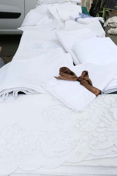 Martine Horel-Bloc a toujours voué une véritable passion pour le beau linge. Depuis une dizaine d’années, cette fille de brocanteur s’est spécialisée dans la vente de linge ancien qui constituait les trousseaux de nos ancêtres. Soigneusement rangé en piles, les trésors du passé qu’elle propose sont en fil, fil de lin, coton ou métis. Des pièces de table, d’office ou de lit parfois parés de délicats monogrammes et de broderies réalisées à la main.