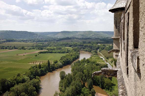 Vue sur le Lot et sa vallée du flanc sud du château avec ses créneaux, ses gargouilles et son échauguette du XIIIème siècle recouverte de tuiles d’ardoises.Lire la suite