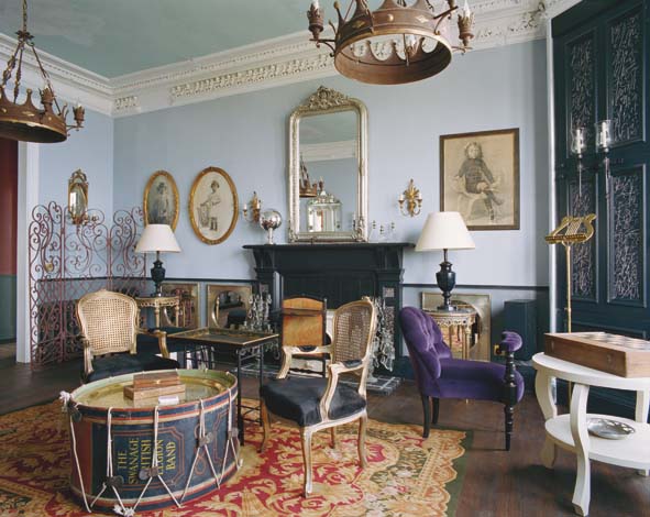 Le Music Room est richement décoré. Les portraits d’enfants ont été chinés aux puces de Vanves et chez un antiquaire londonien. Sous les deux grands lustres italiens en forme de couronne, des fauteuils de casino en velours aubergine prennent place. L’enfilade de miroirs vénitiens permet à la mer de se refléter. Bambi a peint un ciel sur le plafond pour prolonger la superbe vue à l’intérieur de la pièce. Un grand tambour a été transformé en table basse grâce à un plateau marocain. Les volets du «bow window» ont été peints en noir et calligraphiés par Vincent Dubourg. Quelques petits meubles Napoléon III se fondent dans le décorLire la suite