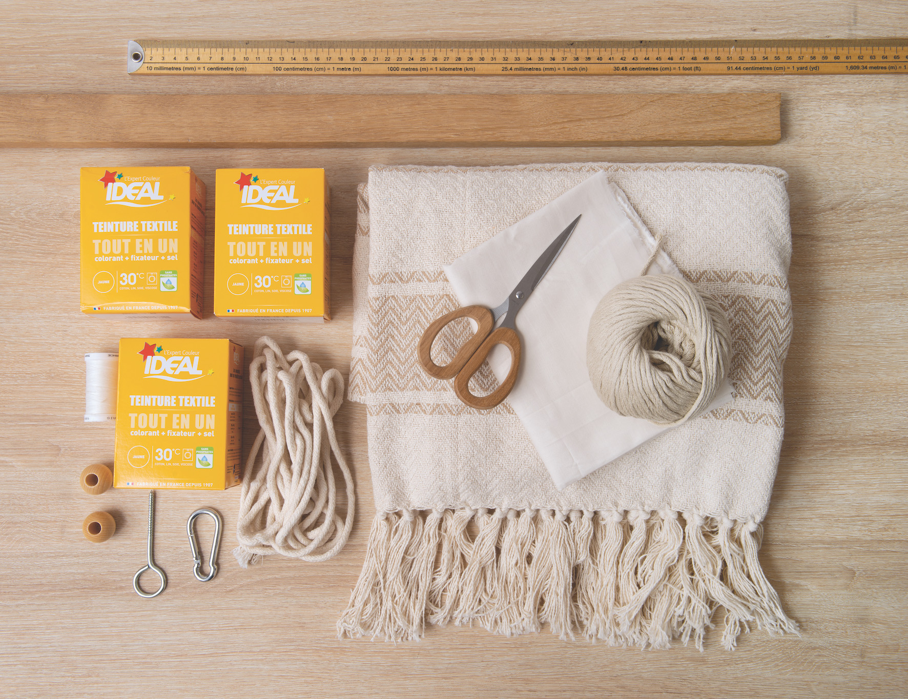 Fournitures : 3 boites de teinture jaune d’or tout en un Idéal • 1 plaid en coton