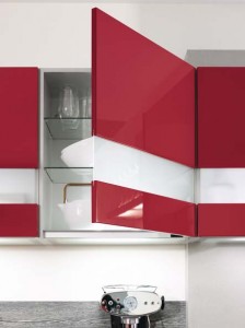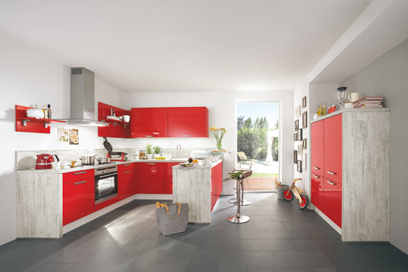Pour qu’une cuisine rouge devienne la pièce maitresse de l’intérieur, le mariage avec des matières brutes, du béton, des bois ou des tons pierres est une solution efficace.