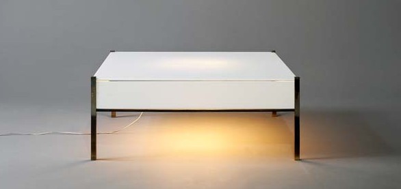 Table basse lumineuse G35, Ateliers de Recherches Plastiques (ARP), éditée chez Disderot, 1954, Laiton doré et opaline, 33x80x 80 cm. Lire la suite