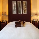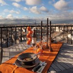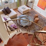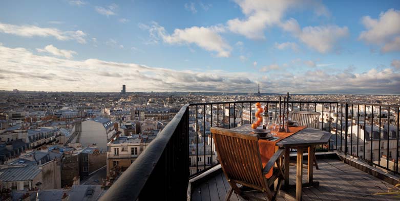 Un grand escalier de style Art Déco en bois exotique permet d’accéder à l’étage supérieur. Il a été entièrement décapé pour retrouver son éclat d’origine. Il est doté d’une rambarde en bronze qui le met en valeur. Une tête de Buddha trône dans le creux de l’escalier. L’ambiance sobre de la chambre, la rend particulièrement confortable et agréable à vivre. La cloison avec éclairage directionnel et indirect apporte une certaine douceur à la pièce. La tête de lit est une création Pierre Henri Bouchacourt. La terrasse panoramique s’avance sur les toits de Paris. Elle surplombe les principaux monuments de la Capitale : la place de la Concorde, les Invalides, les Tuileries, le Tour Eiffel. Ici, la sérénité et reine et on comprend la véritable signification du mot bonheur avec un grand « B » évidemment !