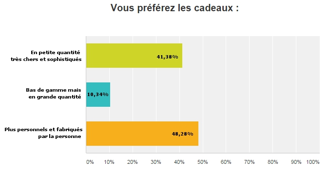 A part les jeunes enfants (jusqu’à 10 ans), les Français apprécient davantage un cadeau fait main qu’un produit acheté en magasin, même très cher ou ultra sophistiqué. C’est ainsi le cas pour plus de 48,28% d’entre eux, qui espèrent avoir un objet plus personnel, chargé d’émotion et avec une réelle histoire. Si 41,38% des interrogés aiment les cadeaux très chers quitte à n’en avoir qu’un seul, seulement 10,34 % des Français préfèrent la quantité à la qualité.