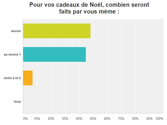 48,28% des Français achèteront tous leurs cadeaux en magasin. Mais 51,73% en fabriqueront de leurs petites mains ! Ainsi 44,83% en feront au moins 1 et 6,90% entre 2 et 5. Le Do it Yourself est l’une des activités les plus prisées par nos compatriotes, le bricolage et la cuisine caracolant en tête !