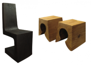 Bertrand Lacourt – Hall 7 – F167 : Les objets de Bertrand Lacourt sont taillés directement dans des troncs d’arbres. Ils sont sculptés d’un seul tenant dans un bloc de bois unique, sans aucun assemblage : ce sont des monoxyles.