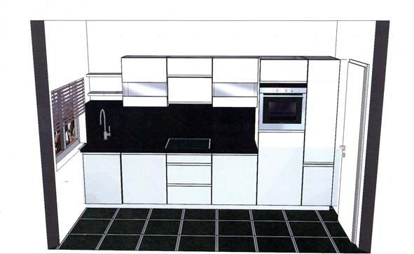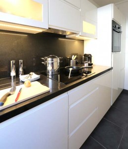 La volonté du propriétaire était d’avoir un espace lumineux, fonctionnel et sobre. Compte tenu de l’exiguïté de la pièce et de sa petite surface (5,44 m2), le cuisiniste a opté pour une configuration en ligne, un seul mur de 3,40 m réunissant toutes les fonctions. Pour transformer la pièce en un lieu contemporain au style épuré et dans une volonté d’esthétisme, le bureau de création Ixina a choisi une association bi-ton : noir pour le plan de travail et la crédence en granit et blanc laqué pour les façades sans poignée. Pour parfaire l’ensemble, un carrelage noir mat a été posé au sol. Quant aux murs peints en blanc satiné, ils inspirent une certaine sérénité engendrant une impression d’espace.