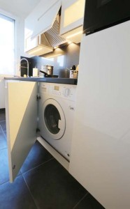 Pour ce projet Ixina a agencé la cuisine autour de quatre pôles : la zone de cuisson (four/table à induction), la zone de lavage (évier/lave-vaisselle), la zone de conservation (réfrigérateur / congélateur) et enfin le stockage, une activité trop souvent négligée et pourtant capitale pour entreposer aliments et denrées fraîches, vaisselle et ustensiles, produits ménagers… Pour le côté esthétique, la hotte d’aspiration est escamotable. Une fois fermée, elle fait partie intégrante du meuble dans lequel elle est totalement dissimulée. Pour l’œil, c’est assez agréable… Dans cet appartement datant des années soixante, la salle d’eau affichant une surface de 3 m2 n’offrait pas un volume suffisant pour l’installation d’une machine à laver. Afin d’optimiser l’implantation, Ixina a donc intégré un lave-linge séchant, un appareil deux en un, idéal pour un logement de 46 m2 où faire sécher le linge devient vite un véritable casse-tête.