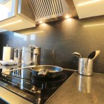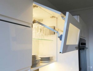 La hotte intégrable Airforce a été posée après l’installation de l’ensemble des meubles hauts. Cette version à recyclage ne nécessite aucun passage de gaine d’extraction. Branchement électrique, jonction avec les meubles et ajustement suffisent. Très esthétique, elle devient invisible lorsque la porte équipée d’un solide ressort est fermée.