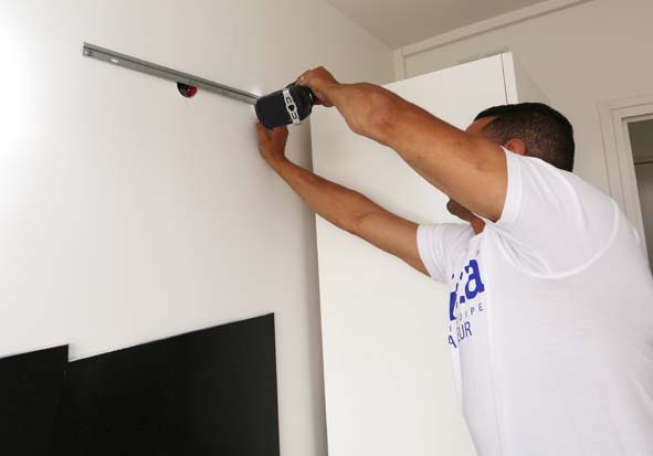 Pose des éléments hauts à l’aide de réglettes servant à accrocher les meubles et à les ajuster avec précision.Lire la suite