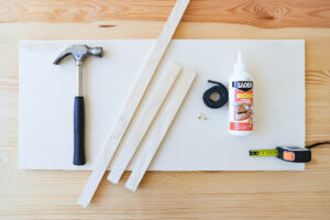 - 1 planche de bois clair contreplaqué dimension au choix. Ici : 32 cm x 70 cm