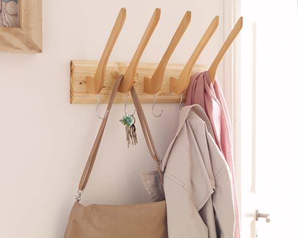L’entrée est la carte de visite de votre maison, et elle est souvent considérée sans importance. Donnez à votre entrée une nouvelle jeunesse grâce à un porte manteau original fabriqué grâce à des cintres en bois placés à l’envers. Vous pouvez faire ce porte manteau vous-même en peu de temps en utilisant les bons outils, il est certain que cela ne passera pas inaperçu.