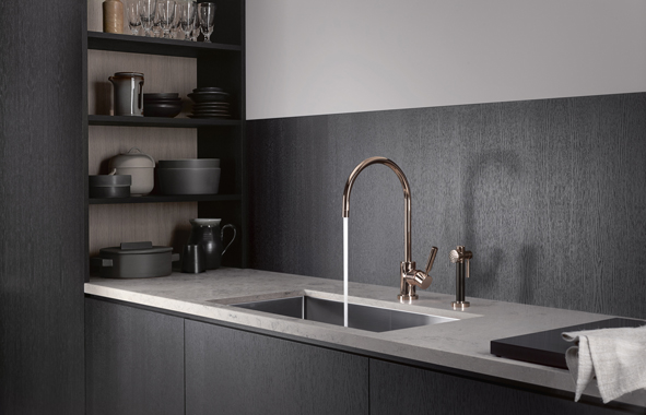 Créée par Dornbracht la finition « Cyprum » savant mélange d’or 18 carats et de cuivre, fait son entrée dans l’univers de la cuisine.