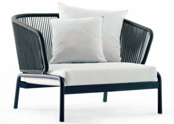 Assises collection « Spool », structure en acier inox laqué avec une peinture poudre. Cordes en polyester. 2 640 €. (Alexander Rose).Lire la suite