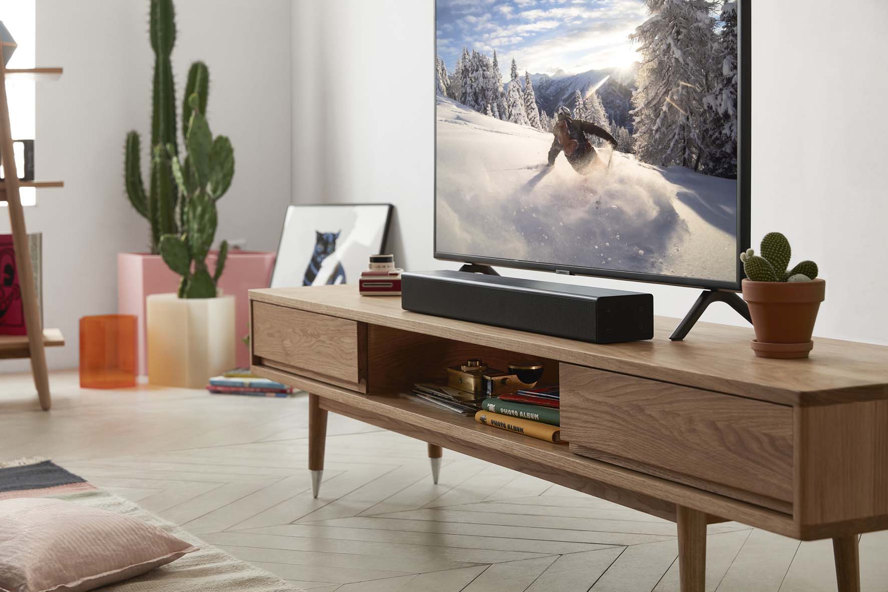 Les lignes discrètes de cette barre de son ultra compacte, de 64cm de large, lui procurent une allure élégante et la garantie d’un intérieur épuré. Elle offre une grande liberté à l’utilisateur pour l’aménagement de son intérieur. Elle peut être accrochée au mur en un clin d’œil grâce à l’accroche murale dédiée et incluse, installée devant le téléviseur, ou encore placée sur un meuble grâce à sa connexion sans fil.