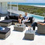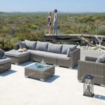 Ensemble en résine tressée coloris naturel grisé « Cape Town » avec coussins gris clair. Chauffeuse 160 €, angle 200 €, pouf 140 €, table basse 219 €, fauteuil 349 €. Lanternes Côme. (Maisons du Monde).