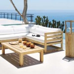 Canapés Cyclades en teck naturel aspect recyclé et coussins, 1 299 €. Table basse « Belle-Île » 259 €, photophore « La Rochelle » 129 €. (Maisons du Monde).
