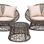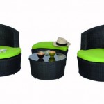 Ensemble 2 fauteuils (95 x 80 x 72 cm) et table avec plateau en verre trempé (50 X 72 cm). Structure aluminium traité époxy. Résine synthétique tressée. Coussinage polyester déhoussable. 399 € (Hespéride).
