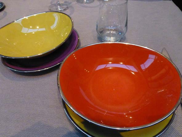 Assiettes en porcelaine de couleur, bord doré, ligne contemporaine. Chef : Fabrice Bonnot « Cuisine et Dépendances » (Lyon).