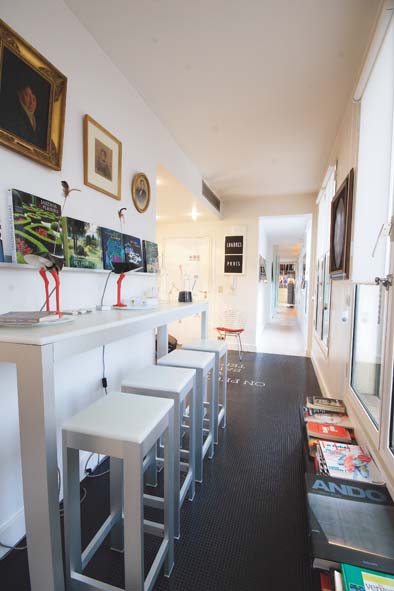 Au-dessus du bar (Har Design), un porte livres en alu a été installé (Benchek). Les lampes Autruche ont été créées par Ingo Maurer. Lire la suite