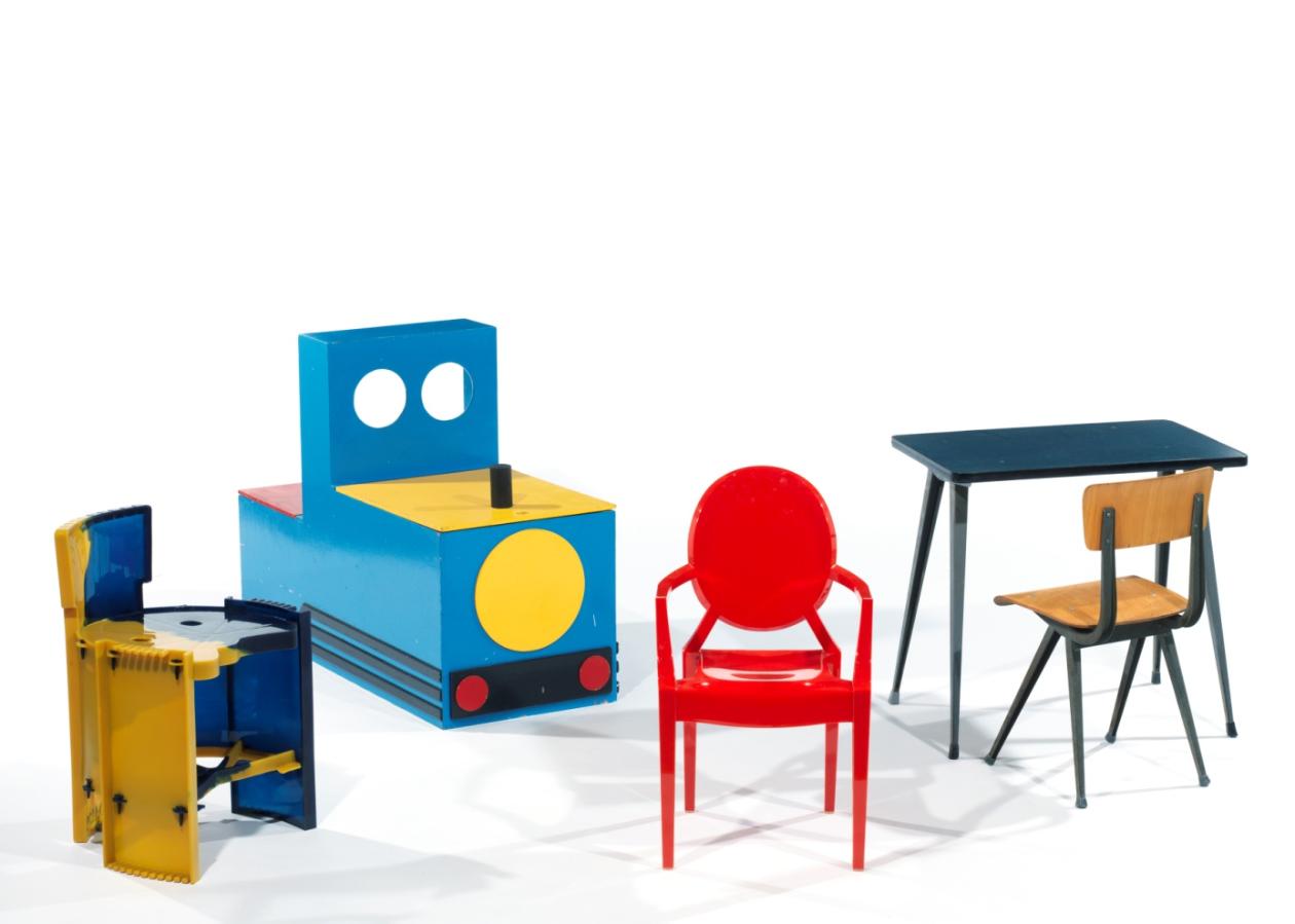 Hollande (Années 50) : Meuble de rangement formant ère de jeux à structure géométrique en bois peint polychrome, il ouvre latéralement par deux abattants sur un coffre, l’ensemble est animé d’un volant, de deux découpes circulaires, d’une prise cylindrique et d’ornements géométriques en application. Hauteur : 71 cm ‐ Largeur : 40 cm ‐ Longueur : 100 cm.