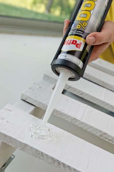 Etape 4 : Poser 5 plots (galette) de colle aux angles et au centre de la palette (pour que le verre reste bien maintenu et ne cède pas si poids sur la vitre).Lire la suite