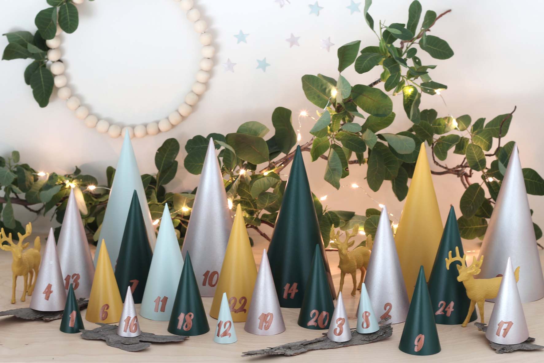 Disposer les cônes harmonieusement sur une table, un buffet ou encore une cheminée. Glisser sous chaque cône un petit cadeau.
