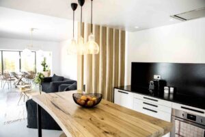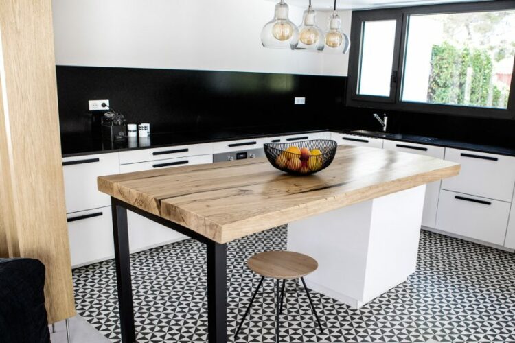 Le salon, équipé d’une télévision, d’un canapé confortable Bed & Philosophy et d’un accès wifi, est idéal pour se détendre tout en admirant la vue sur le jardin et la piscine. La cuisine moderne est équipée de tous les appareils nécessaires. Avec son îlot central et ses touches rétro, c’est un espace convivial pour les repas en famille ou entre amis.