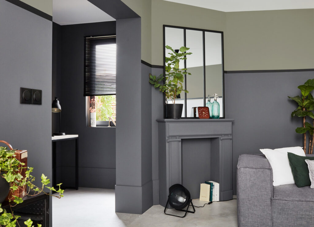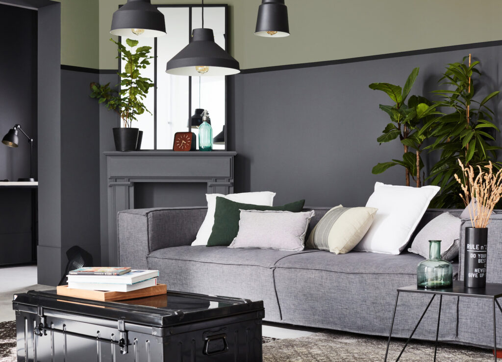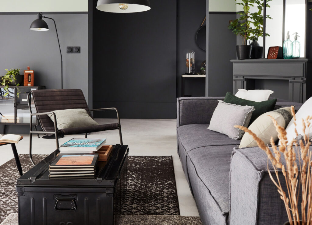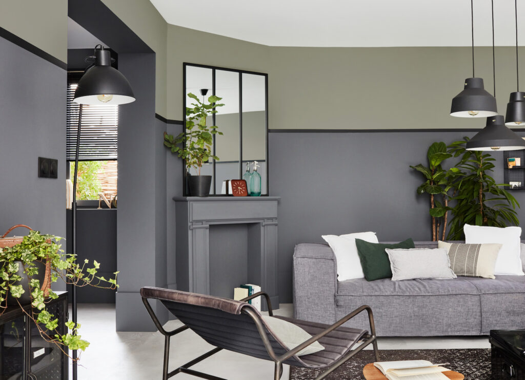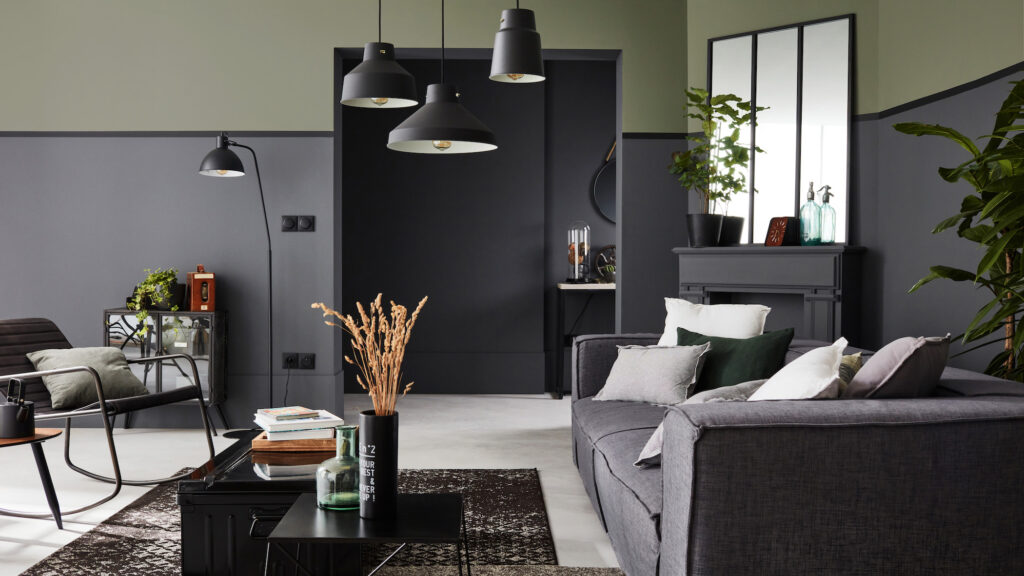 Dans ce salon industriel, le gris-vert foncé s’associe au vert kaki.
